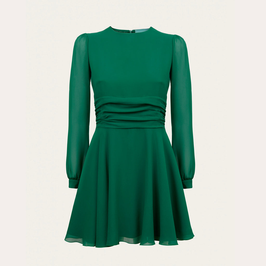 Indossa il nostro mini abito iconico Cleo Dress in pura georgettes di seta verde inglese per sentirti perfetta in ogni occasione. La costruzione del capo, le finiture rigorose e i dettagli minuziosi garantiscono un fit perfetto per tutte le taglie. Questo abito versatile, definito 'Bon Ton Glam', combina le caratteristiche classiche di un abito bon ton con un tocco contemporaneo.