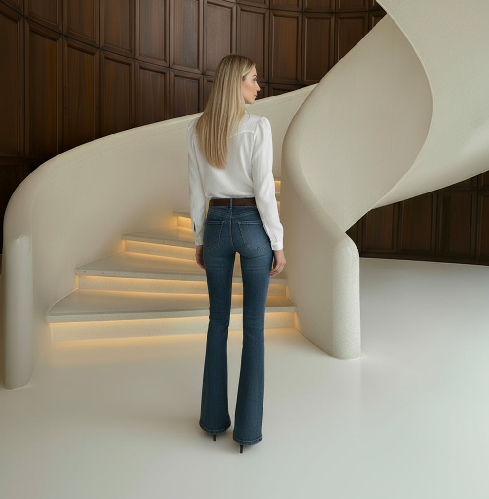 Il Jeans in Denim Aurèlie di Celeste Pisenti ha un taglio elegante e glam. A vita alta, 5 tasche in morbido denim, comodo e super stretch, perfetto per un Look Parigino Ispirato alla modella Aurèlie Claudel con eleganza contemporanea grazie alla vita alta ed il fondo leggermente a zampa .