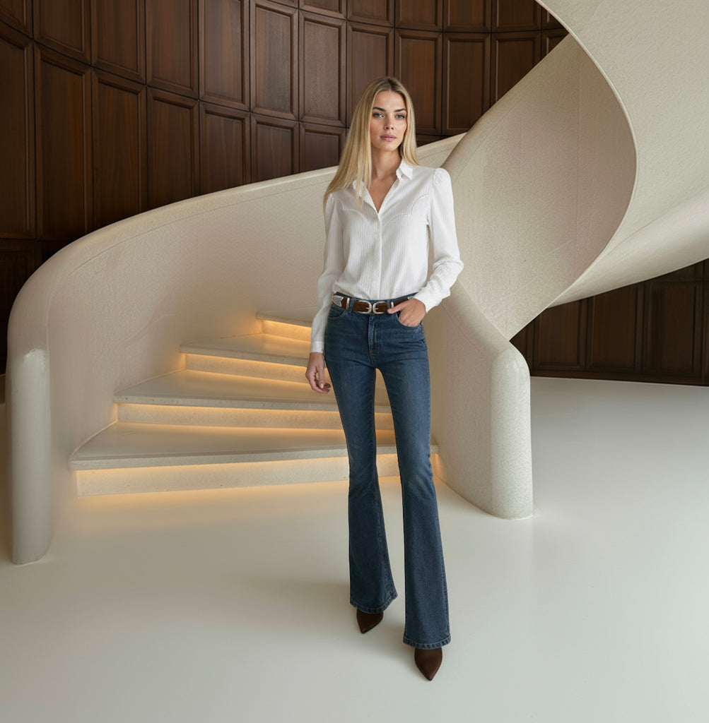 Il Jeans in Denim Aurèlie di Celeste Pisenti ha un taglio elegante e glam. A vita alta, 5 tasche in morbido denim, comodo e super stretch, perfetto per un Look Parigino Ispirato alla modella Aurèlie Claudel con eleganza contemporanea grazie alla vita alta ed il fondo leggermente a zampa .