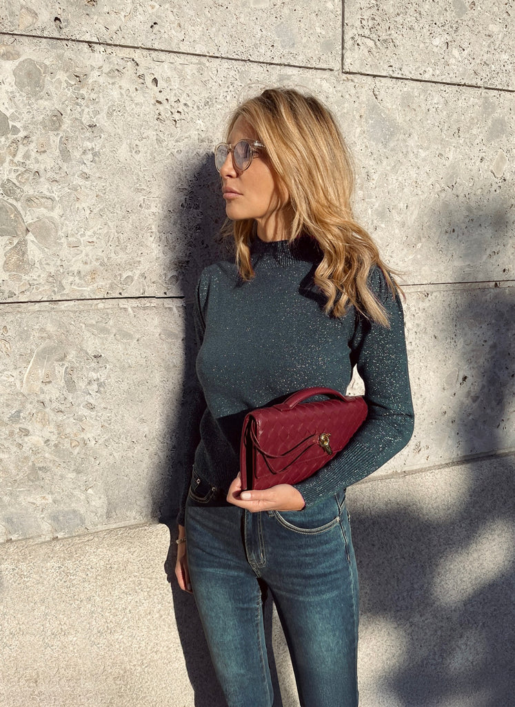 Il Jeans in Denim stretch Camille di Celeste Pisenti ha un taglio elegante e glam. A vita alta, 5 tasche in morbido denim, comodo e super stretch, perfetto per un look da giorno speciale. Il colore del Denim ha una nota di blu pavone che lo rende unico.